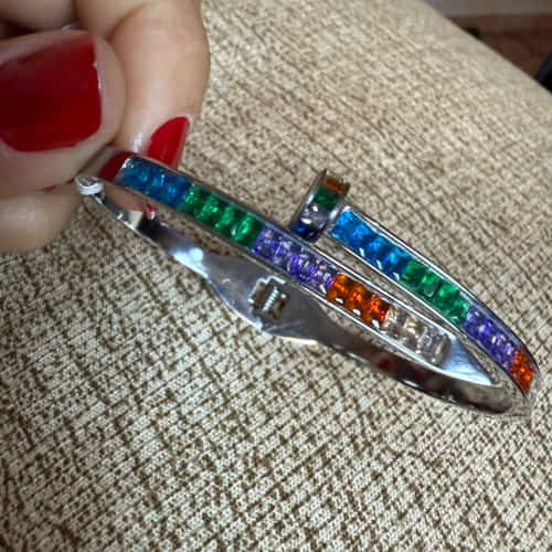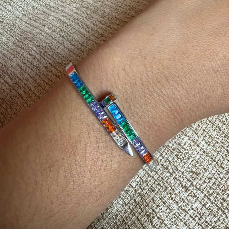 BRACELETE MODELO PREGO COM DESIGN MODERNO E INOVADOR, BANHADO A RÓDIO BRANCO E CRAVEJADO COM ZIRCÔNIAS COLORIDAS EM TONS VIBRANTES. UMA PEÇA AUTÊNTICA E CHEIA DE PERSONALIDADE, IDEAL PARA QUEM BUSCA UM TOQUE DE COR E ESTILO NO VISUAL. PERFEITO PARA SER USADO SOZINHO OU EM COMPOSIÇÕES COM OUTRAS PULSEIRAS. UM ACESSÓRIO QUE TRANSMITE FORÇA, ORIGINALIDADE E SOFISTICAÇÃO.