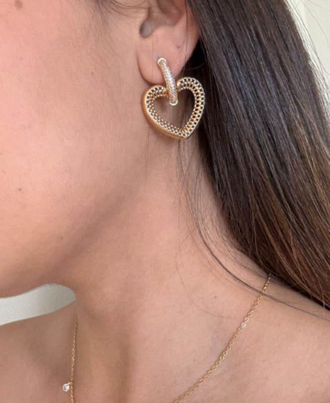 BRINCO EM FORMATO DE CORAÇÃO COM DESIGN ELEGANTE E TRABALHADO EM TEXTURA VAZADA, REALÇADO POR UMA ARGOLA COM ZIRCÔNIAS CRAVEJADAS. PEÇA BANHADA A OURO 18K E ANTIALÉRGICA, PERFEITA PARA DESTACAR A BELEZA COM DELICADEZA E SOFISTICAÇÃO. IDEAL PARA COMPOR LOOKS ROMÂNTICOS E MODERNOS COM UM TOQUE DE EXCLUSIVIDADE.