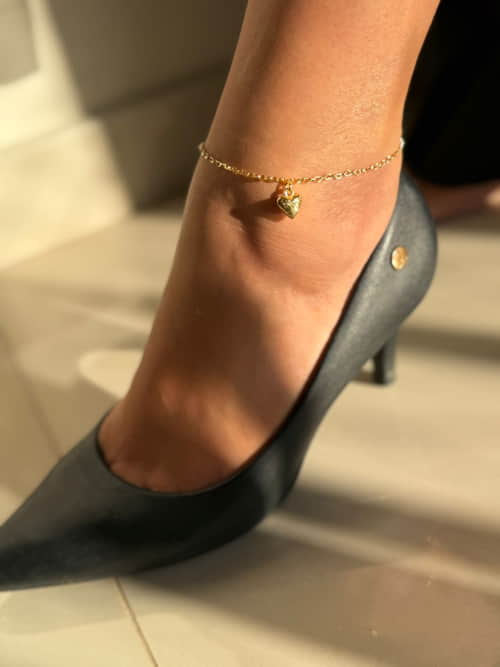 ENCANTE-SE COM A DELICADEZA DESTA TORNOZELEIRA, PERFEITA PARA REALÇAR A BELEZA DOS SEUS PASSOS. COMPOSTA POR UMA CORRENTE DOURADA FININHA E UM CHARME EM FORMATO DE CORAÇÃO TRABALHADO, ELA UNE ELEGÂNCIA E ROMANTISMO EM UMA PEÇA SUTIL E VERSÁTIL.