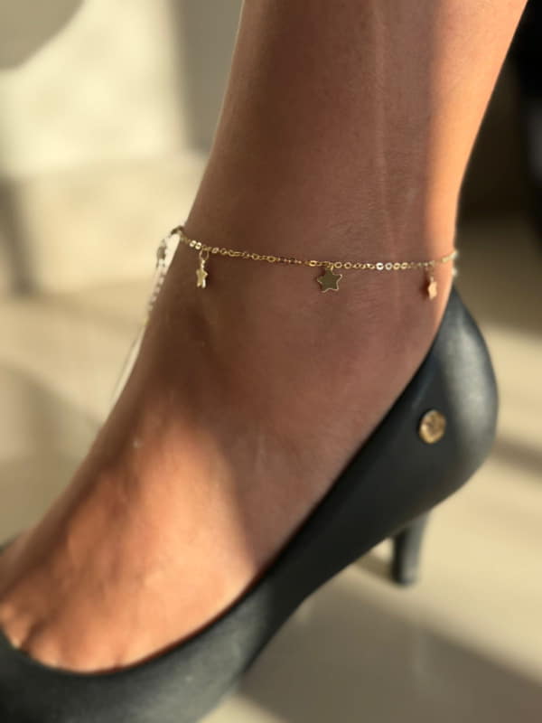UMA PEÇA DELICADA E ENCANTADORA! ESTA TORNOZELEIRA É COMPOSTA POR PINGENTES DE ESTRELAS POLIDAS QUE TRAZEM UM TOQUE DIVERTIDO E LEVE PARA O VISUAL, SEM DEIXAR DE LADO A ELEGÂNCIA.